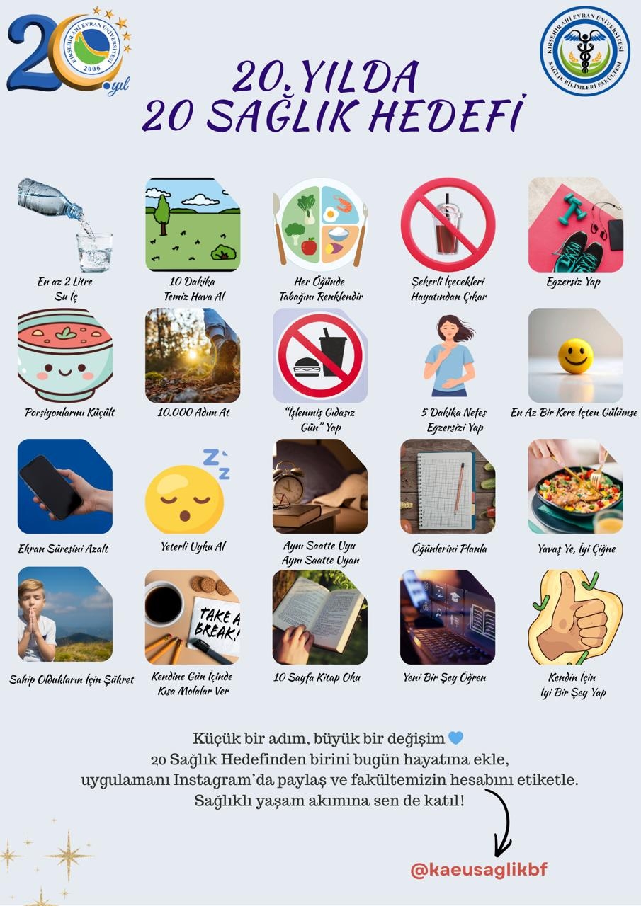 Üniversitemizin kuruluşunun 20. yılını, Fakültemizin “Sağlıkta 20. Yıl, Sağlıklı 20 Yıl” soganı ile kutluyoruz. Hazırlıklarını büyük bir heyecanla sürdürdüğümüz bu özel süreçte; tüm öğrencilerimizin, öğretim elemanlarımızın ve paydaşlarımızın kıymetli katkılarını bekliyoruz.