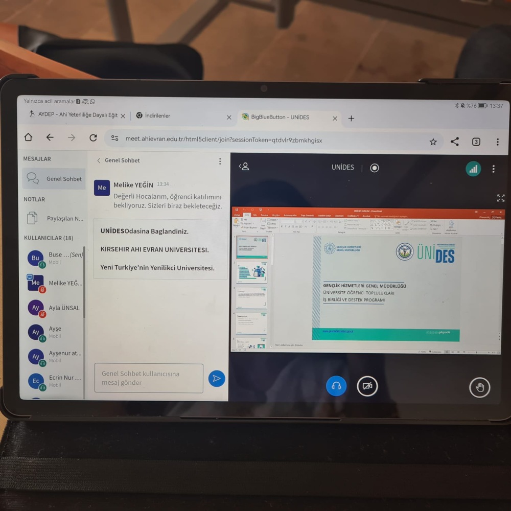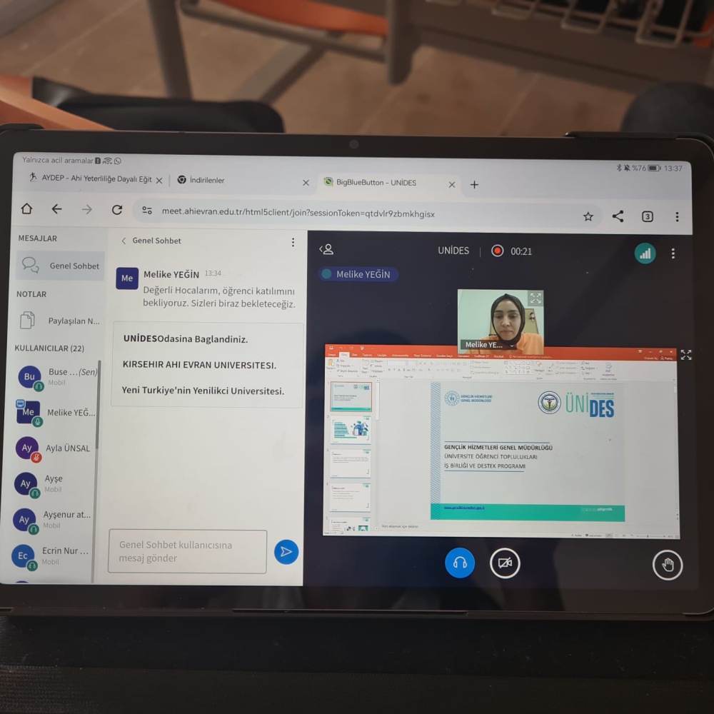 Fakültemiz Beslenme ve Diyetetik Bölümü Araştırma Görevlisi Melike Yeğin tarafından 6 Ekim 2025 tarihinde çevrimiçi olarak ÜNİDES projesi eğitimi gerçekleştirildi. Öğrenci toplulukları danışman hocaları ve öğrencilerimizin katıldığı eğitim, soru- cevapla son buldu.